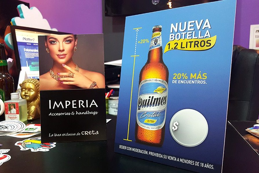 Los mejores displays para mostradores y escritorios encontralos en Plotter7. Realizados con la mejor calidad de impresión látex sobre PVC espumado de 3mm y con un pie trasero removible para poder guardarlo cuando quieras.